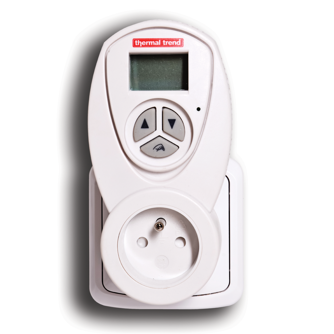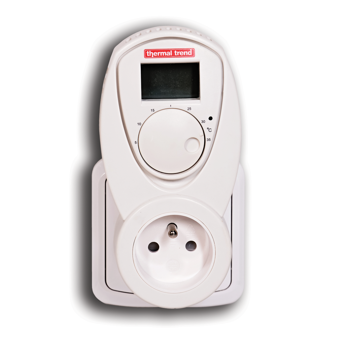 je zásuvkový termostat se snadným nastavením teploty pomocí otočného ovladače, LCD displayem a LED signalizací. Má krytí IP20, termostat instalujeme do zásuvky v zóně 3, samotný radiátor může být umístěný ve všech zónách.